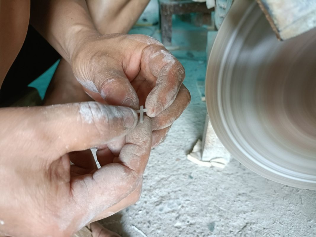 The artisan will have to sharpen the mussel shell under water for a long time to remove the dirty layer of the shell to reveal the beautiful iridescent shell, this stage is quite meticulous when the shell is honed under water and also using sandpaper smooth the outer surface of the shell